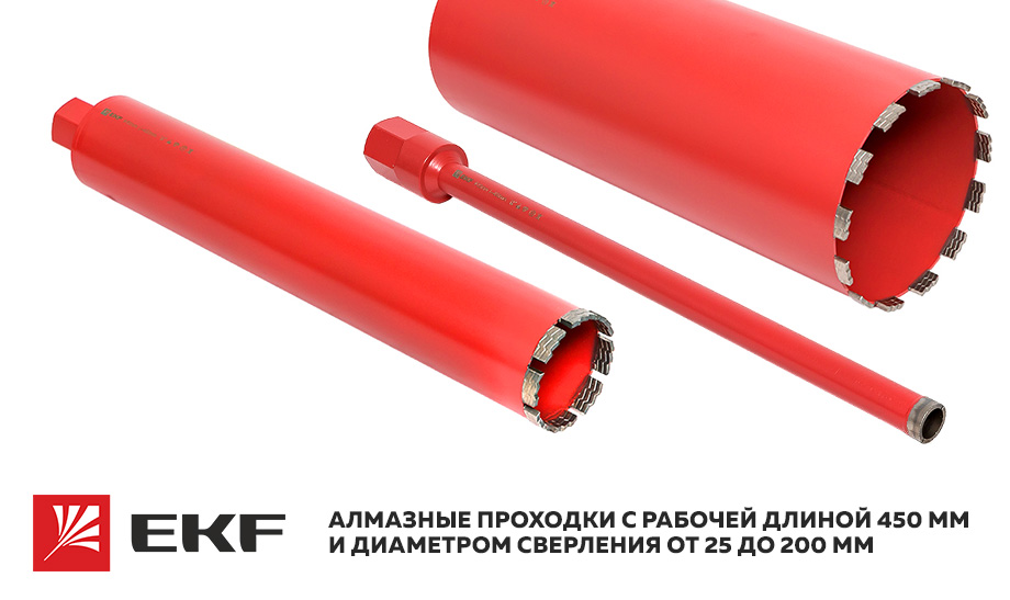 EKF расширяет ассортимент и предлагает широкий выбор алмазных проходок с рабочей длиной 450 мм и диаметром сверления от 25 до 200 мм.