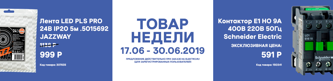 Участники последней в июне акции «Товар недели» - это светодиодная лента серии LED PLS PRO торговой марки JAZZWAY и контактор EasyPact TVS Schneider Electric. С 17 по 30 июня указанные продукты можно приобрести по специальной цене.