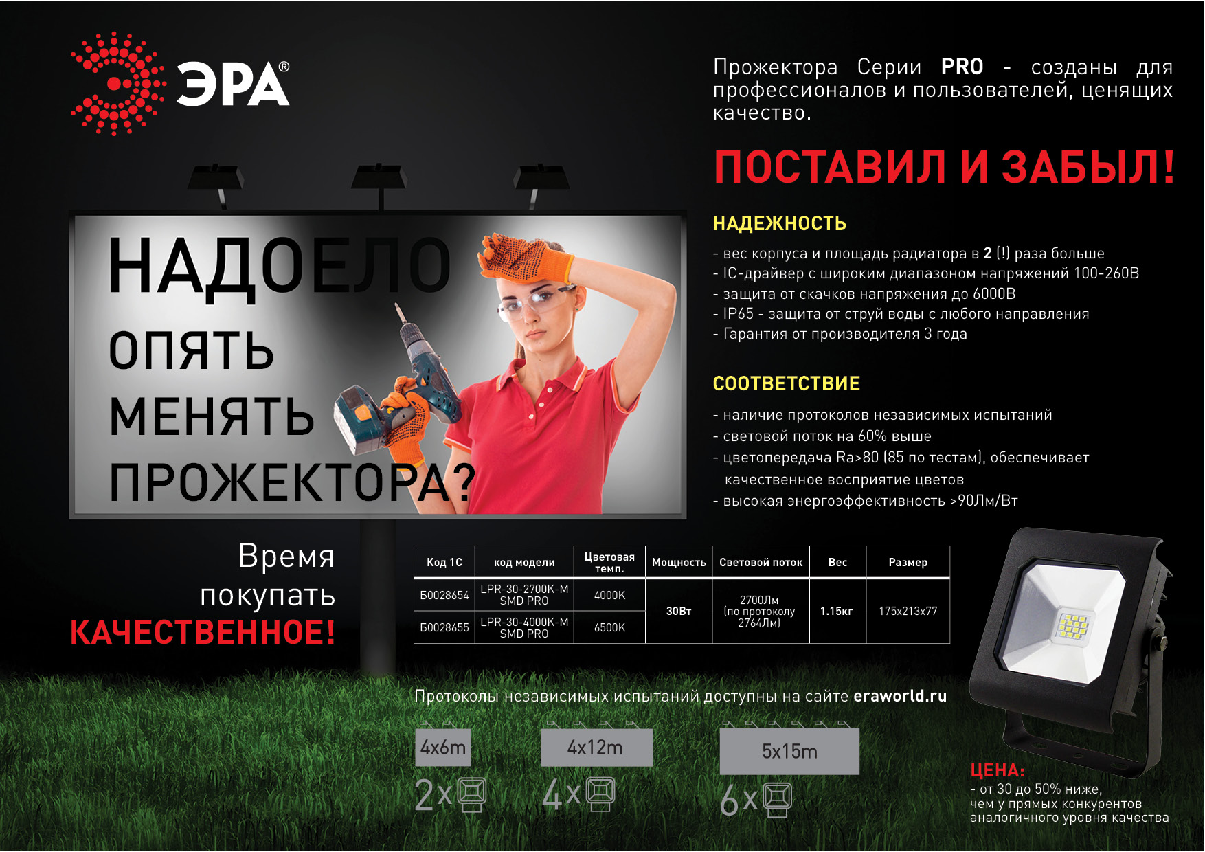 LPR-30-4000K-M SMD PRO ЭРА Прожектор светодиодный уличный 30Вт 2700Лм 4000K 213х175 (16/192) |