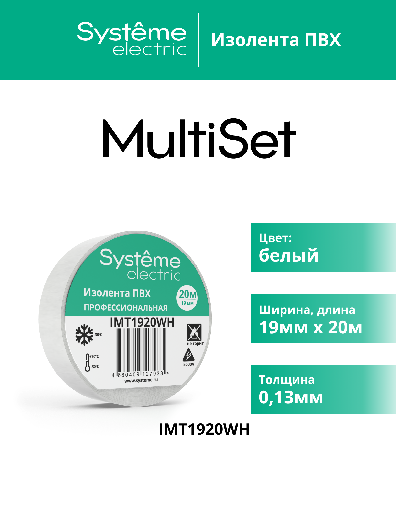 MULTISET Изолента ПВХ 19 мм Х 20 м, толщина - 0.13 мм, БЕЛАЯ |