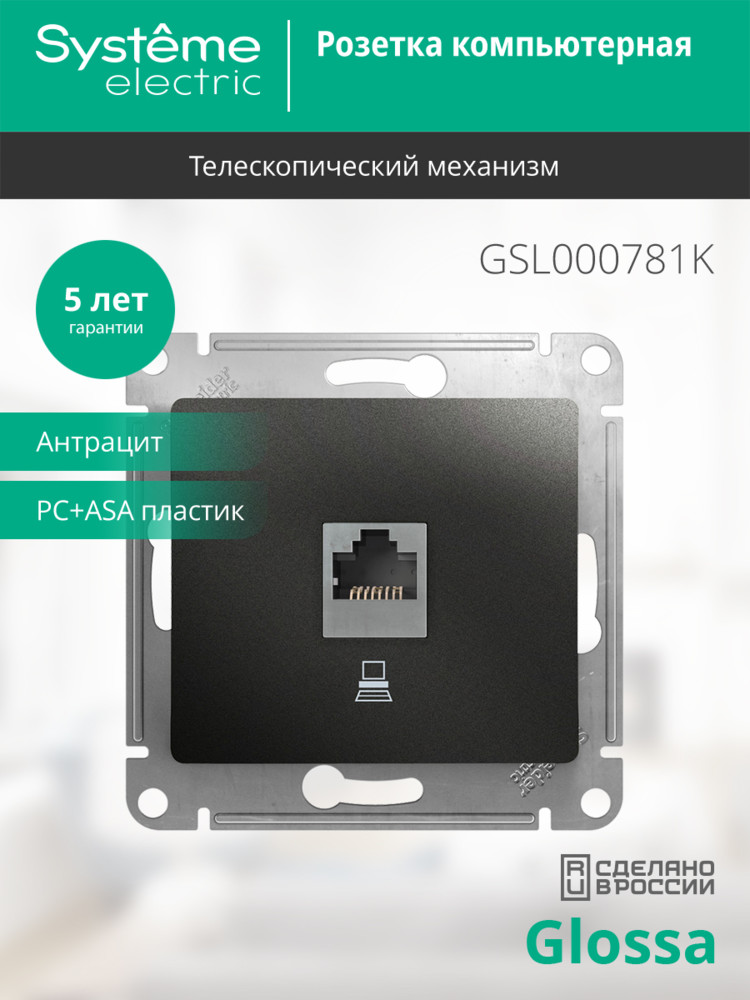 GLOSSA РОЗЕТКА компьютерная RJ45 кат. 5e, механизм, АНТРАЦИТ |