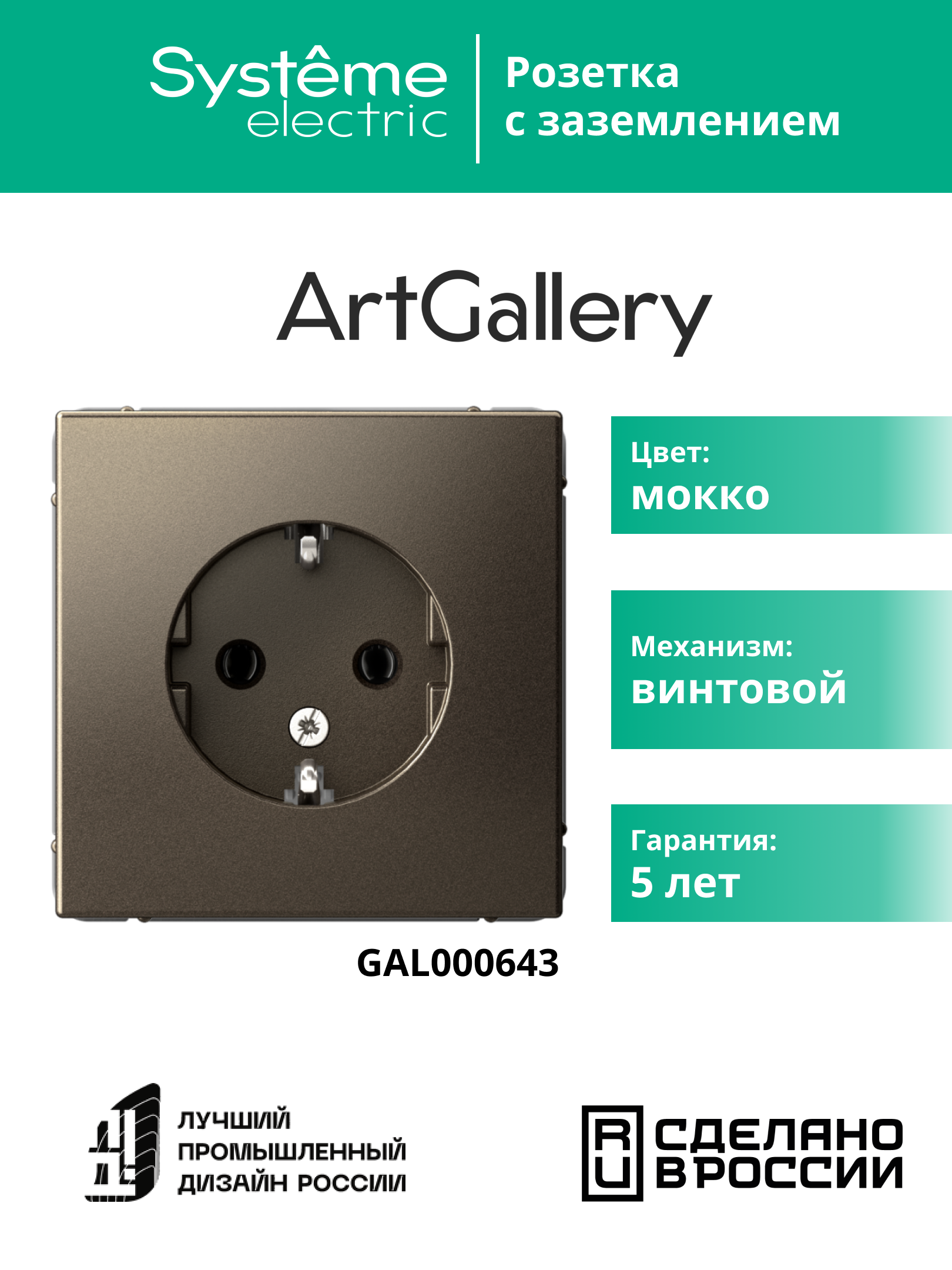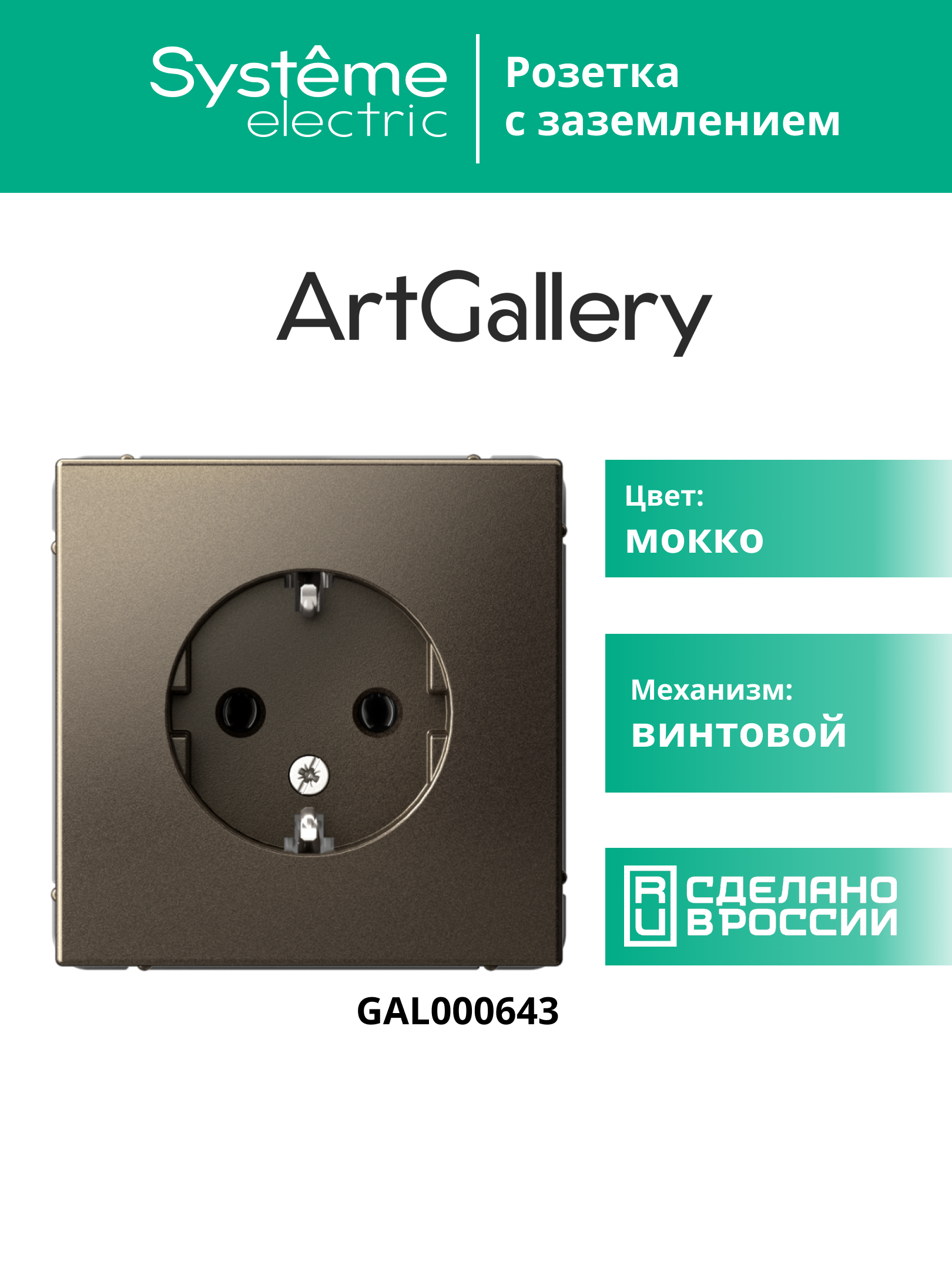 ARTGALLERY РОЗЕТКА с заземлением, 16А, механизм, МОККО |