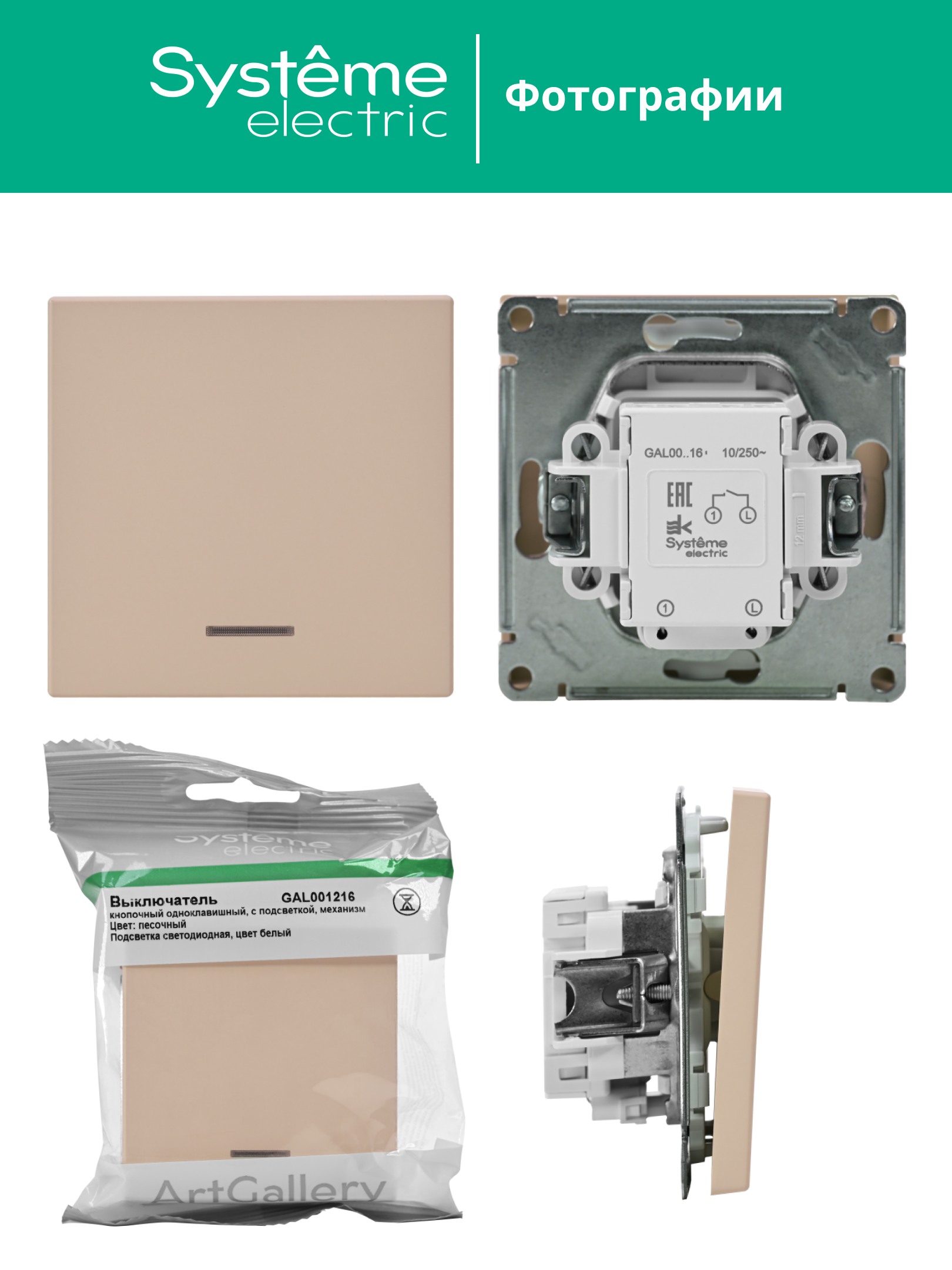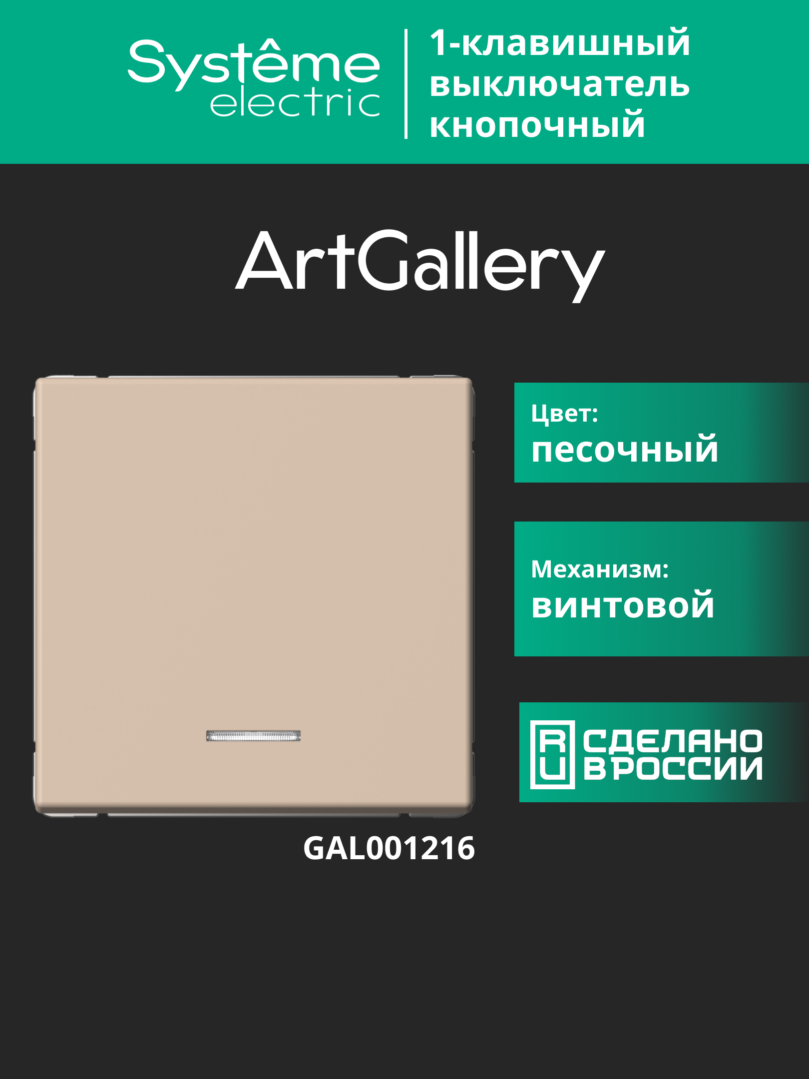 ARTGALLERY 1-клавишный ВЫКЛЮЧАТЕЛЬ КНОПОЧНЫЙ с подсв., 10А, механизм, ПЕСОЧНЫЙ |
